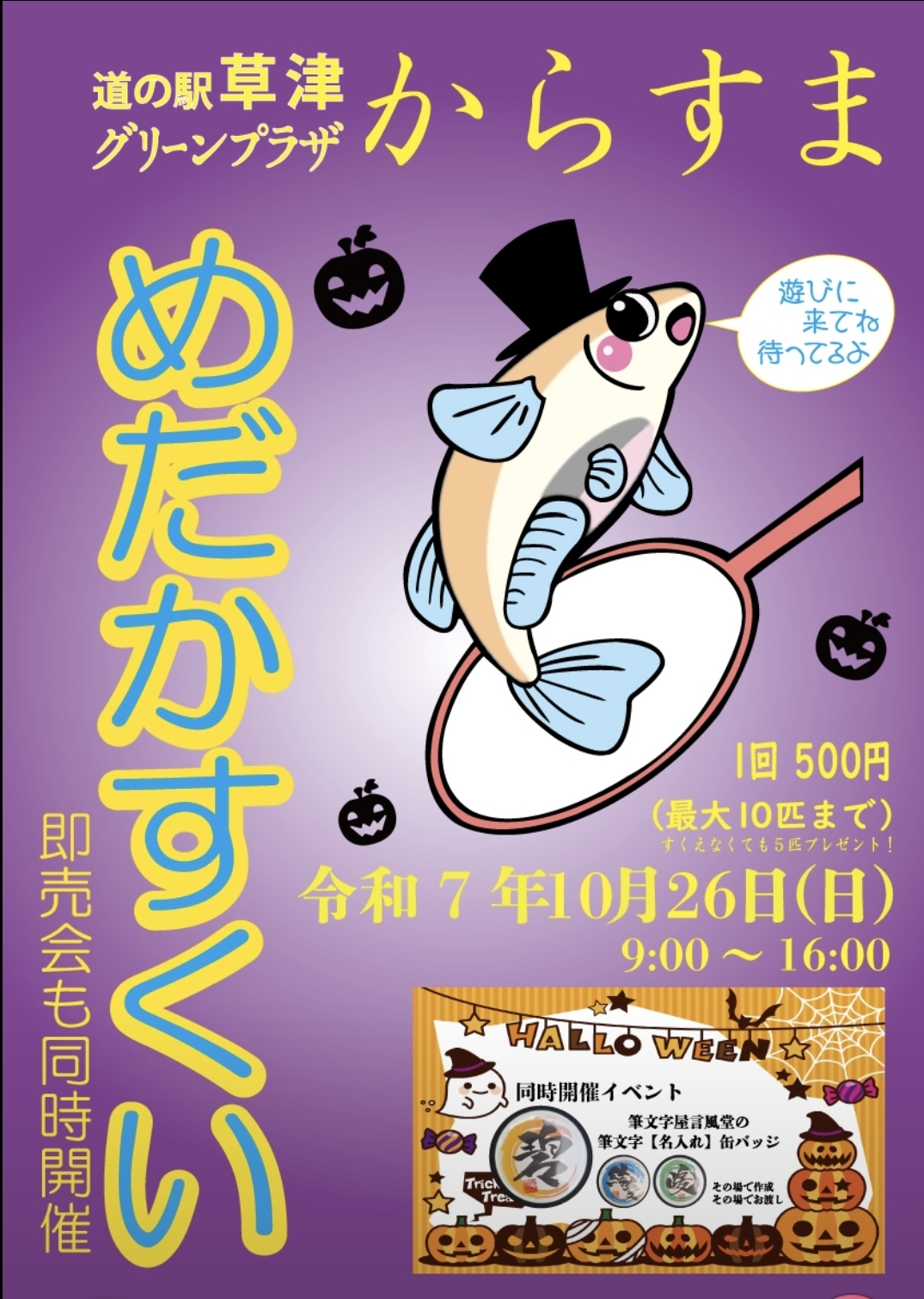 恒例の大人気めだかすくいイベントが10/26(日)に道の駅草津にて開催!!