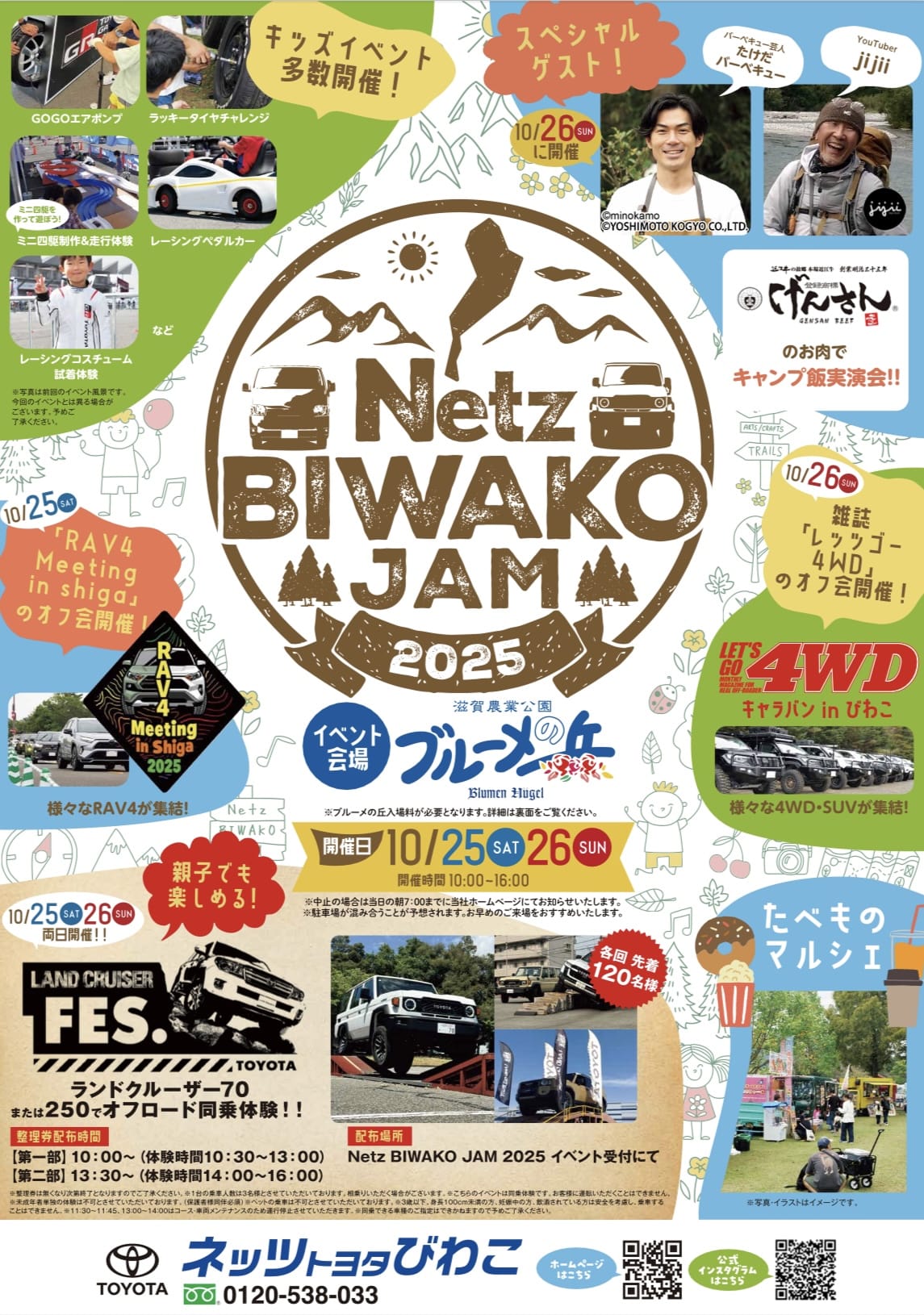 今年のNetz BIWAKO JAMでは特別企画も行われます。10月25日(土)はRAV4オーナーが集結する「RAV4ミーティング」、26日(日)は様々な4WD車・SUVが集まる「LET’S GO 4WDキャラバン in びわこ」が同時開催され、SUV好きは必見のイベントです!