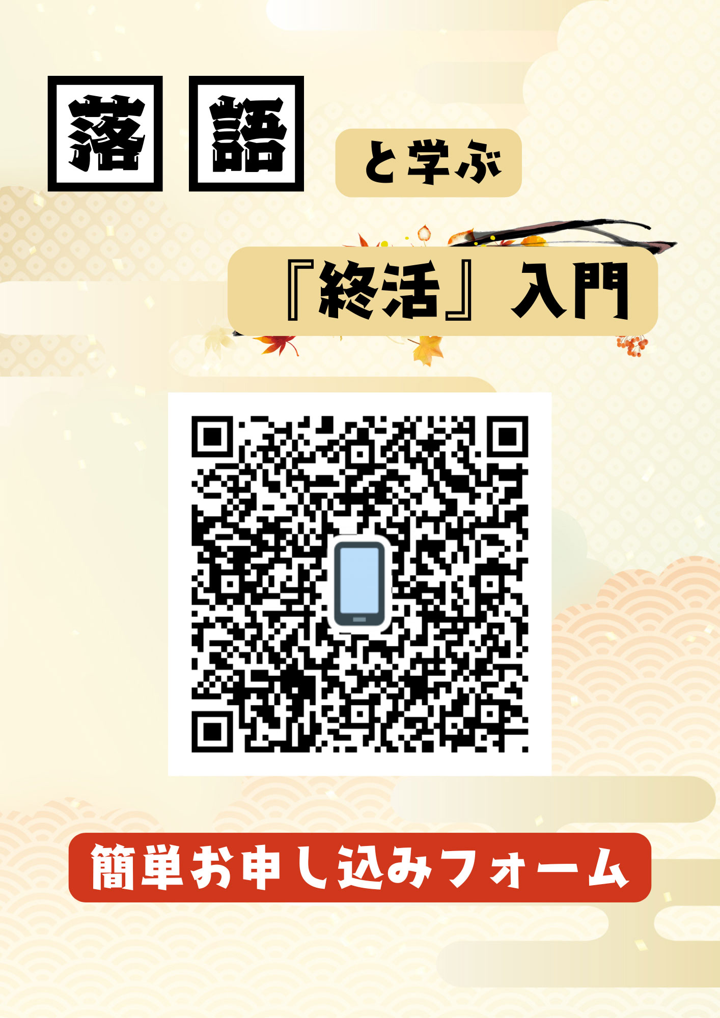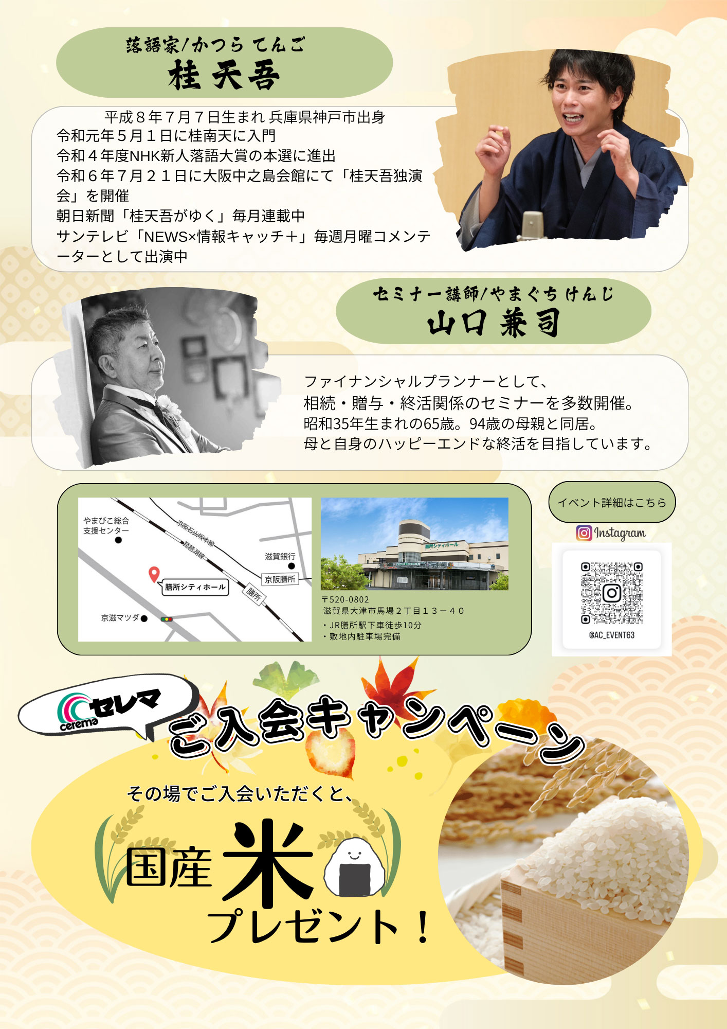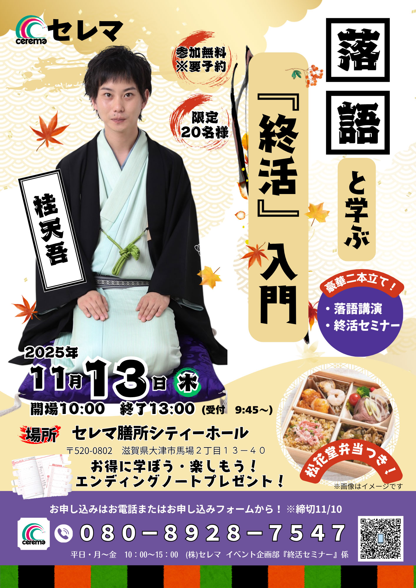 今注目の若手落語家・桂天吾(かつらてんご)さんによるユーモアたっぷりの落語を楽しみながら終活のヒントを感じ、専門家のやさしい解説で「終活ってこういうことなんだ」と気づける時間をお届けします。