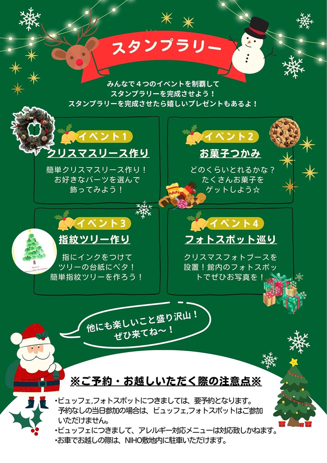 結婚式場NIHOで、①クリスマスリース作り、②撮影スポットでの撮影、③お菓子つかみ、④指紋ツリー があります。