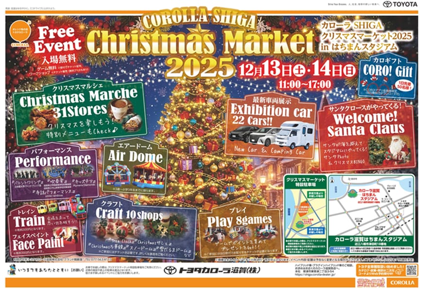 近江八幡にあるカローラ滋賀はちまんスタジアムで、「カローラ滋賀 クリスマスマーケット2025」が、2025年12月13日(土)・14日(日)に2日間で開催されます。