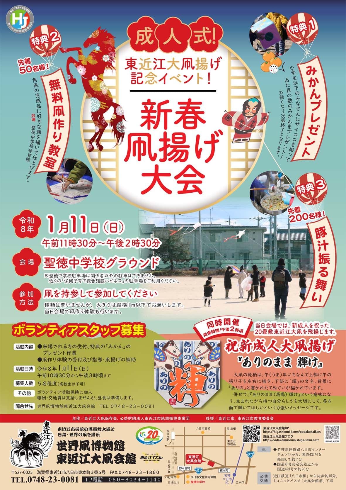 新成人をお祝いする20畳敷の東近江大凧が、大空に舞い上がる姿は迫力満点です!今年の大凧には「ありのまま 輝け」というメッセージが込められており、午後2時頃の飛揚が予定されています。