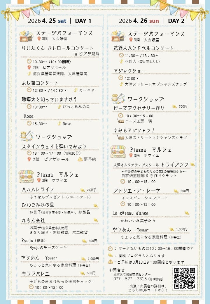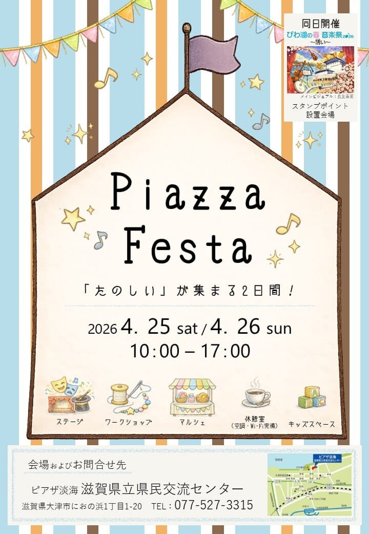 ピアザ淡海 滋賀県立県民交流センターでは、近隣のびわ湖ホールで開催される「びわ湖の春 音楽祭」の関連イベントとして、「Piazza Festa」を開催いたします。