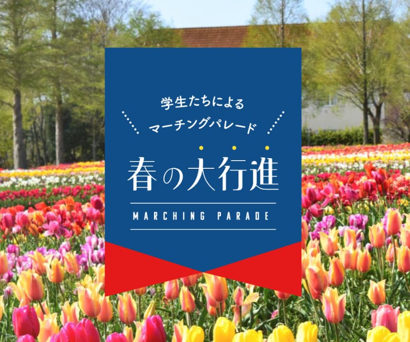 各日とも午前・午後の2回公演で、入場ゲートからアスレチック前広場までの園内コースをマーチングで練り歩きます。満開のチューリップが咲く園内で、学生たちの元気いっぱいのパフォーマンスをぜひご覧ください♪